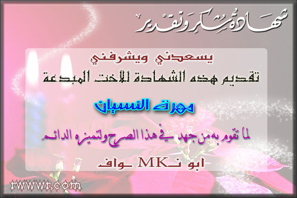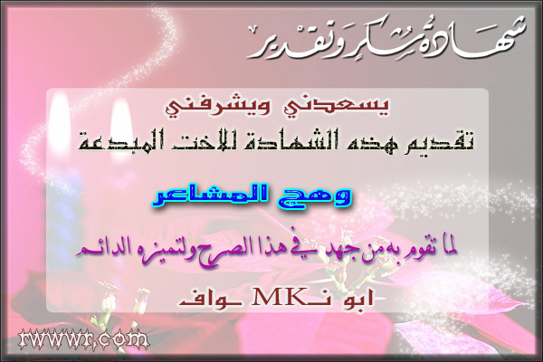 رد: جـــــــدار شهــــــادات تمــــــيز اعضــــــاء منتدى مجالس الرويضه يشـهـد العـضـو / المـشـرفة. .السنيورة ......... بأن العضو / المشرف ... اسير الغربه ............ حـصــل عــلــي / شــهــادة تـقـديــر وشــكــرواحترام بــنــاء عــلــى/ ......نشاطه وعطائه الكبير ........ |