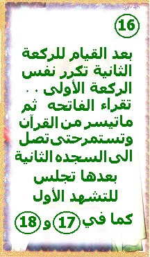 مجموعه من الصور عن كيفية الصلاه تساعد الام فى تعليم الطفل القواعد والخطوات الصحيحه للصلاه متمنيه الاستفاده للجميع ![]() ![]() ![]() ![]() ![]() ![]() ![]() ![]() ![]() ![]() ![]() ![]() ![]() ![]() ![]() ![]() ![]() ![]() إذا كانت الصلاة صلاة فجر أي ركعتين فإنك تقول بدل التشهد الأول التشهد الثاني كما في الصورة رقم 20 ثم تسلم كما في الصورة 21 . 2. إذا كانت الصلاة صلاة الظهر أو صلاة العصر أو صلاة العشاء أي أربع ركعات فإنك بعد قول التشهد الأول في الركعة الثانية تقوم لأداء الركعة الثالثة كما في الركعة الأولى تماماً دون تشهد وتقوم من السجدة الثانية في الركعة الثالثة لأداء الركعة الرابعة وفي هذه الركعة تجلس بعد السجدة الثانية وتقول التشهد الثاني الموجود في الصورة 20 ثم تسلم كما في الصورة 21 . 3. إذا كانت الصلاة صلاة مغرب أي ثلاث ركعات فإنك بعد قول التشهد الأول في الركعة الثانية تقوم لأداء الركعة الثالثة وفي هذه الركعة تجلس بعد السجدة الثانية وتقول التشهد ![]() ![]() الاستغفار : (( أستغفر الله ، أستغفر الله ، أستغفر الله )) (( اللهم أنت السلام و منك السلام تباركت يا ذا الجلال و الإكرام )) (( سبحان الله )) 33 مرة (( الـحـمـد لله )) 33 مرة (( الله أكـــبر )) 33 مرة وتمام المئة نقول: لا اله الا الله وحده لاشريك له له الملك وله الحمد وهو علي كل شء قدير م/ن