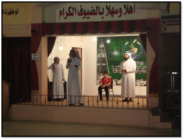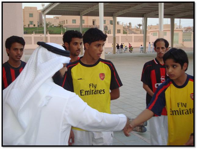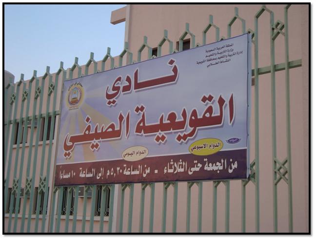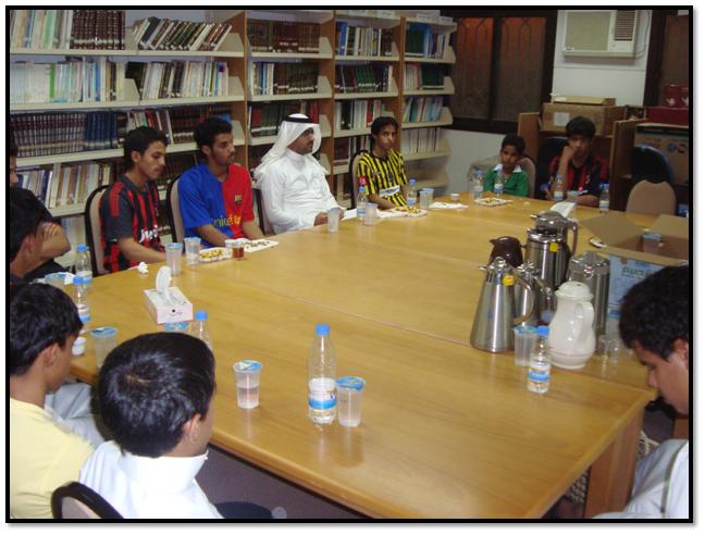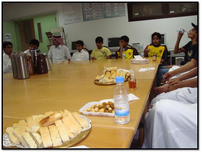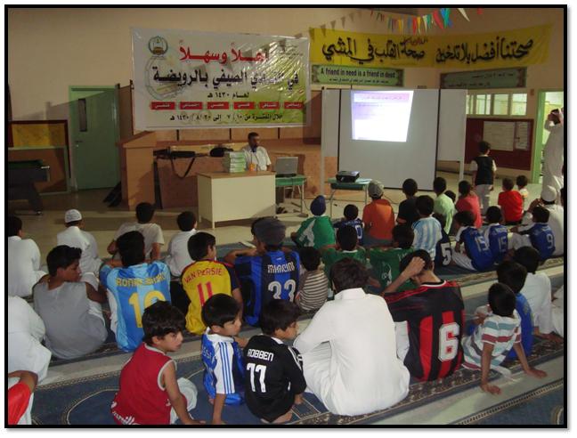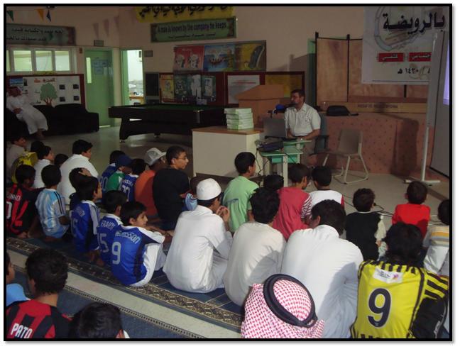 | أعضاء مجالسنا الكرام ننقل لكم بالصور فعاليات الأسبوع الرابع لنادي الرويضة الصيفي حيث كان من برامج نشاط التوعية الإسلامية تسميع لمسابقة القرآن والسنة التي أُعلن عنها من أول أسبوع في مقر النادي وهي كالتالي : مسابقة القرآن الكريم المستوى الأول : حفظ ثلاثة أجزاء المستوى الثاني : حفظ جزئين المستوى الثالث : حفظ جزء واحد مسابقة الحديث الشريف المستوى الأول : حفظ خمسين حديث المستوى الثاني : حفظ ثلاثين حديث المستوى الثالث : حفظ خمسة عشر حديث * ومن برامج النشاط العلمي إستضافة الدكتور / جمال عبدالناصر بيطار من مستشفى الرويضة العام وإلقاء محاضرة بعنوان ( إنفلونزا الخنازير ) * * * * ومن فعاليات هذا الأسبوع زيارة لنادي القويعية الصيفي حيث تم إختيار مجموعة من الطلاب مع بعض المشرفين للقيام بهذه الزيارة الطلاب أثناء مغادرة مقر النادي * وصولهم لمقر نادي القويعية الصيفي * * * أحد مشرفي نادي القويعية أثناء استقباله لوفد نادي الرويضة دخول وفد نادي الرويضة لمقر الضيافة بنادي القويعية وفد نادي الرويضة في ضيافة مدير نادي القويعية * فقرات ترحيبية بوفد نادي الرويضة *