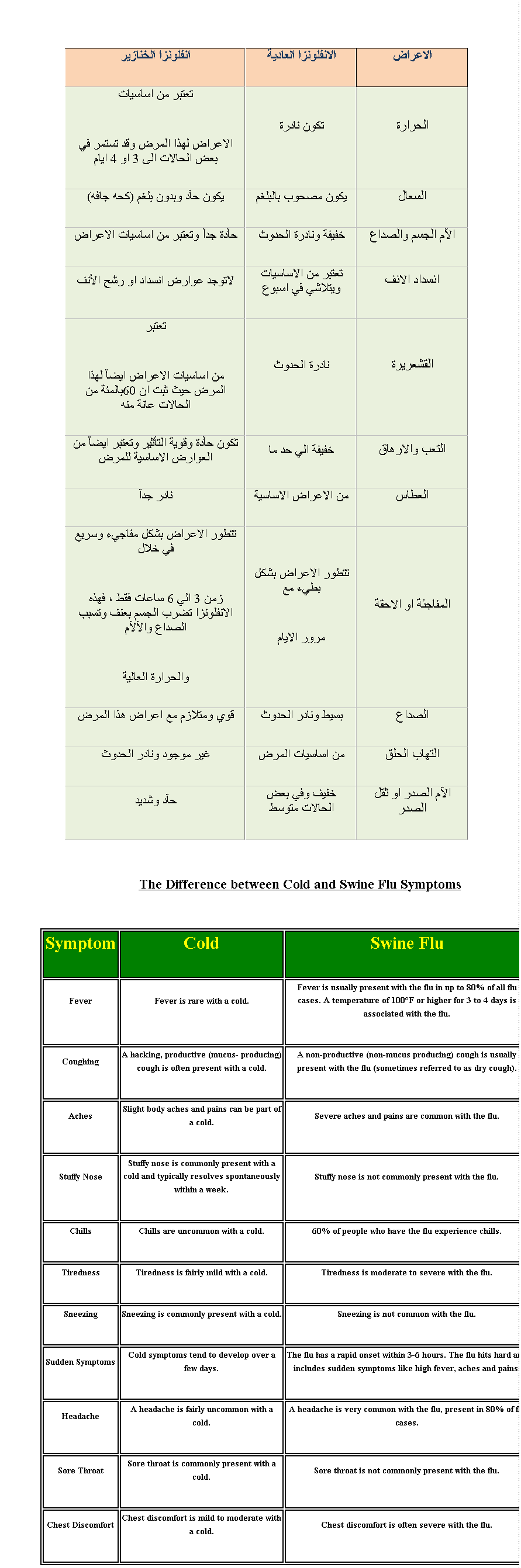 رد: جدول يوضح الفرق بين الأنفلونزا العادية الموسمية وانفلونزا الخنازير |