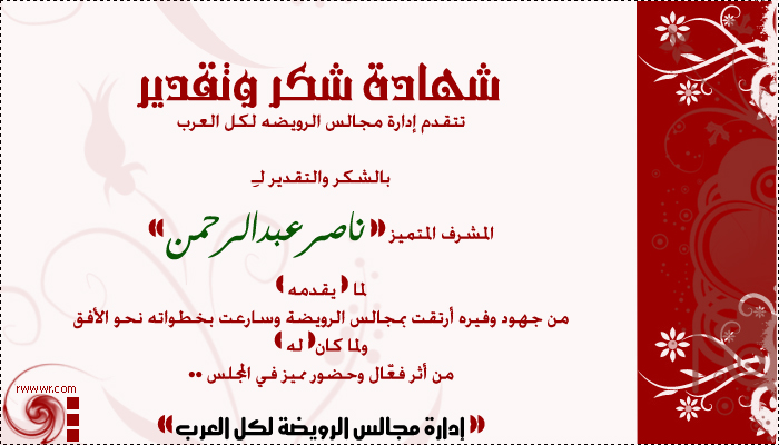 [ إحتفاليه خاصه جداً ] _ تكريم المتميزين للعام ( 1430هـ / 2009 م ) http://photos.7be.com/thumbnail/photos/1466-600x480.jpg.. المُنّجِــــــز ُونْ .. http://photos.7be.com/thumbnail/photos/1466-600x480.jpg أُناس لاتصنعهم الصُدفه .. ولايجلبهم الحظ .. إنجازاتهم مُكتمله .. تمردوا على أنصاف الحلول بمهاراتهم وجِدِهمّ فصاغوا بإبداعاتهم حُلولاً لكل عائق يعترض طريقهم كُلُ هذا لإنهم ..!! مارسوا ( أنصاف ) نزعة النجاح في ذواتِهِم وضخوا فيها عبقرية ( النمـــــو ) .. يزهر النجاح على آثآرهم وينبت في حقول طموحهم كل عمل ( مثمر ) جعلوا همهم الإبداع وتركوا المجال لــِ عملهم ليكون المتحدث الرسمي لهم فكان عملهم هو الأفصح لساناً والأقوى بياناً سخروا إمكاناتهم لـِ منفعة الجميع وكتبوا أسماءهم في سجلات المجد الأبديّه .. http://photos.7be.com/thumbnail/photos/1466-600x480.jpgبإسم إدارة مجالس الرويضه لكل العرب http://photos.7be.com/thumbnail/photos/1466-600x480.jpg إسمحوا لنا بإن نحتفل سوياً بـِ مجموعه من المتميزين والمُبدعين والمُنجزين من الأعضاء .. وَ المشرفين .. وَ المراقبين .. الذين أستحقوا مجموعه من الأوسمه .. نظير جهودهم خلال العام المنصرم ( 1430هـ _ 2009 م ) |
