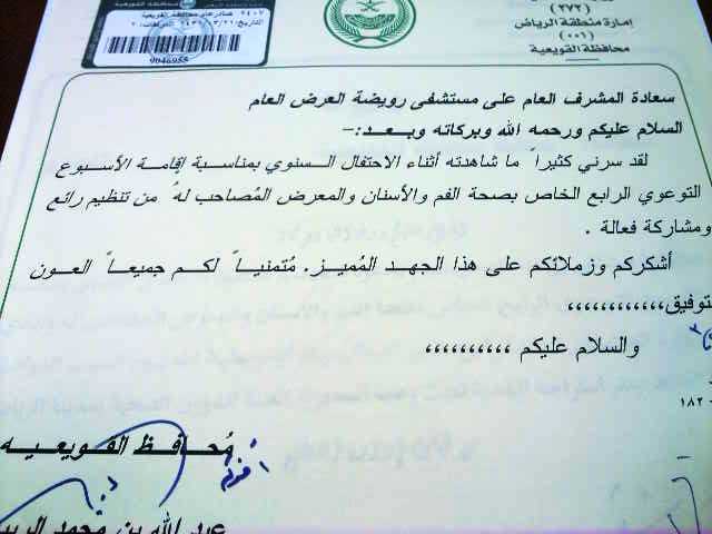 بسم الله الرحمن الرحيم السلام عليكم ورحمة الله وبركاته اليكم صورة من الخطاب الموجة الى مستشفى الرويضة من محافظ القويعية بتاريخ اليوم الاربعاء الموافق 24/ 3/ 1431 هـ بالبريد وهو عبارة عن خطاب شكر وتقدير لمستشفى الرويضة بشان اسبوع الاسنان ![]() ![]() فلكا الشكر منا يا ابا خالد ... ويعلم الله ان حضورك زاد حفلنا نجاحا ودعما لا مثيل له تحياتي لكم