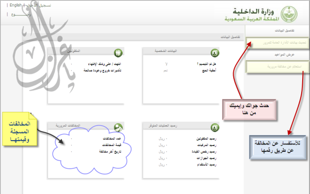 | السلام عليكم ورحمة الله وبركاته عن طريق موقع الخدمات الألكترونية بوزارة الداخلية تقدر تعرف عدد مخالفاتك المرورية والمبالغ المستحقة وتحديث معلوماتك في نظام ساهر الجديد ومعلومات عن إقامات مكفوليك وأحقيتك بتأدية فريضة الحج فقط ادخل رقم بطاقة الأحوال الأقامة وأكتب الكود ثم ارسل أدخل للموقع :: هنـــــا :: وتابع الشرح ![]() ![]() |