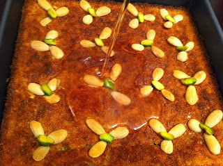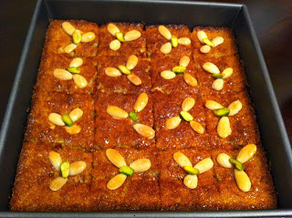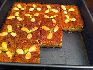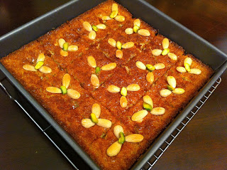 | طريقة عمل الهريسة على طريقة ضياء (النمورة) الهريسة نوع من الحلويات الشامية التقليدية التي لاغنى عنها في كل بيت حلو لذيذ ومشهي وطعم لايقاوم التصنيف : حلويات النوع : شرقية مدة الطهي : 25 دقيقة عدد الأشخاص : 8 أشخاص المقـــاديـر 1/2 1 كوب سميد خشن 1 كوب سكر 1/2 كوب جوز هند 1/4 كوب حليب بودرة 1 رشة صغيرة ملح 1/4 ملعقة صغيرة بيكربونات الصودا 2 ملعقة صغيرة باكينج باودر 1/2 كوب زيت ذرة 1 كوب روب ( لبن زبادي) 1 ملعقة صغيرة فانيليا سائلة للتزيين لوز أنصاف فستق حلبي أنصاف 1/2 1 كوب تقريبا شيرة ( قطر/ شربات ) الطريقة 1 أحضري قالب مربع مقاس 9 بوصة أو طبق فرن متوسط الحجم، إدهني القالب بطبقة خفيفة من الطحينة (الهردة) أو بالسمن، إتركيه جانبا. في طبق عميق، ضعي السميد، السكر، جوز الهند ،الحليب، الملح، البيكربونات، البيكنج باودر والفانيليا، بإستعمال ملعقة خشبية، قلبي المواد لتختلط. أضيفي الزيت، الزبادي والفانيليا، قلبي المكونات جيدا لتختلط مع إستمرارية التقليب لمدة دقيقة إلى أن يصبح الخليط متجانس ولين. صبي الخليط في القالب، إطرقي القالب على الطاولة عدة طرقات بهدوء إلى أن يتوزع الخليط على شكل طبقة ويغطي قاع القالب تماما أوبإستعمال ظهر الملعقة إفردي الخليط جيدا. بإستعمال سكين حادة قطعي الهريسة دون أن تصلي إلى قاع القالب كما هو موضح بالصورة, وزعي اللوز والفستق مع الضغط عليه قليلا لتثبتيه، إتركي القالب بحرارة المطبخ لمدة ساعة لترتاح. ثبتي الرف الشبكي في وسط الفرن، سخني الفرن إلى درجة حرارة 180م. 7 أدخلي القالب إلى الفرن، إخبزي لمدة 25 دقيقة إلى أن تصبح لون ذهبي غامق. أخرجي القالب من الفرن، وزعي القطر مباشرة فوق الهريسة ، دعيها إلى أن تبرد تماما ثم قطعيها إلى مربعات وضعيها في طبق التقديم . * يمكنك التجهيز المسبق لعمل الهريسة بعد الإنتهاء من تحضيرها دون أن تضيفي لها البيكربونات الصودا، غلفي الطبق باحكام بقطعة من ورق البلاستيك وضعيه بالثلاجة واخبزيه في اليوم التالي. . * يمكنك إضافة أي نوعمن المكسرات على حسب رغبتك والمتوفر لديك. وبالصحة والعافية